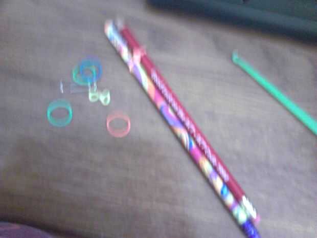aprender a hacer un agarre de lápiz del arco iris del telar.Paso 1: materiales -Bandas de diferentes colores. Estoy usando sólo dos.-Telar arco iris-Hook(Metal or Plastic)-Charm(optional)Paso 2: Colocación de las bandas. 1.) hacer una figura 8 (signo