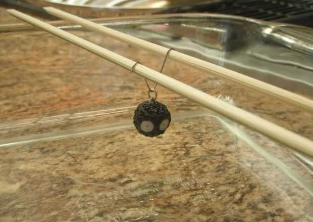 También no quería que los granos sentados en la bandeja y fundirse en un gran lío, así que hice un pequeño gancho de alambre y shish Kebab de palos. Para ello, doble "V" de alambre y luego doblar los extremos hacia atrás. (Cuadro 1) Colocar los dos palitos de shish kebab por todo el borde de una cacerola, deslice su sprite de hollín en el cable y poner la "V" en los sticks de shish kebab. (Foto 2)