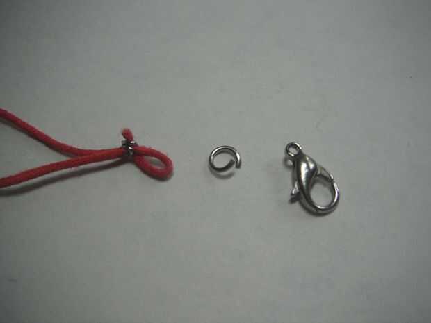 Abra el último anillo del salto y deslizar el lazo pequeño y el corchete de la langosta. Ahora a cerrar el anillo del salto y tienes tu correa!