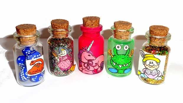 MATERIALESEncanto de botella de vidrio con corcho (éste tiene un anillo en el corcho)Bola de algodónBrilloCosita (yo usé un clip porque no pude encontrar nada en mano) de agitaciónColorante de alimentoPistola de pegamento calienteCordón de cueroPaso