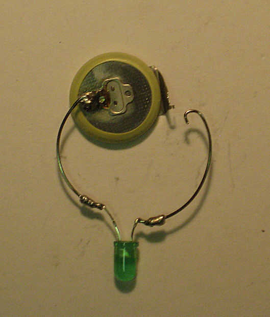 Doblar otro gancho en el otro brazo del bastidor. Gancho a la cabeza doblada de la batería para cerrar el circuito y enciende el led.