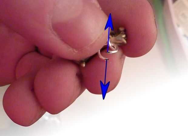 2. Anillo de salto abierto , a través de agujero y cerrar.  Abrir el anillo del salto doblando los extremos hacia los lados.  Flexión lateral permite fácil pellizcar para cerrar y no deformar el anillo.