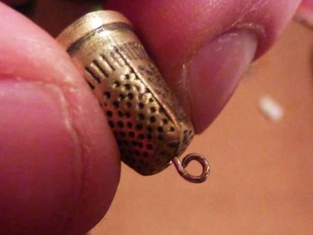 Del encanto dedal es un poco difícil.  Un agujero centrado en la parte superior de los cartuchos es el lugar natural.  Sin embargo, el interior es demasiado pequeño para acceder con herramientas.  Solución-hilo eyepin de adentro hacia afuera.