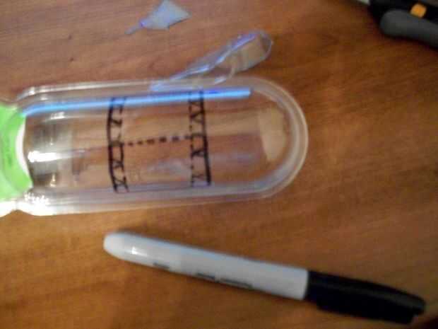 El primer diseño se me ocurrió fue demasiado pequeño como para caber el cordón de mis audífonos.  Así que tenlo en cuenta mientras dibuja tu diseño en el plástico con el rotulador.