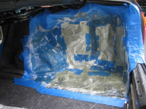 Mezclar el epoxi según las indicaciones y aplicar ligeramente el área con cinta. En primer lugar, aplique sobre una fina capa de epoxi para dar la fibra de vidrio algo para agarrar a. Pegue el mat de fibra de vidrio a la superficie después saturan la fibra de vidrio con epoxi. Puede utilizar el rodillo de pequeños fondos para suavizar los bordes ni burbujas. Dejarlo secar según las instrucciones hasta que tiene una cáscara dura de una sola capa.