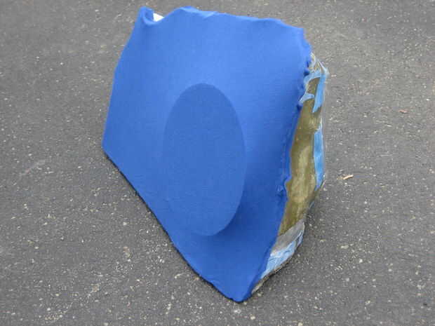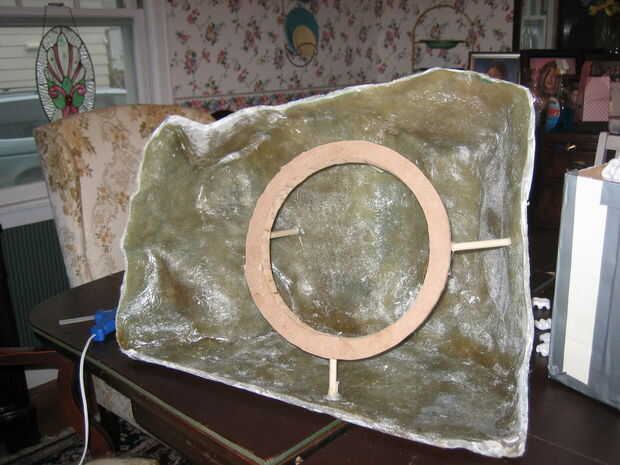 El anillo de montaje de altavoz debe montarse al recinto secundario de tal manera que puede soportar la presión de capas de la fibra de vidrio en los siguientes pasos pero también ser extraíble cuando estén completos. Para ello cogí un taco barato y cortar en 4 trozos. Usé pegamento caliente para crear a una especie de sistema de soporte de trípode que el anillo en la ubicación adecuada de la 3D.