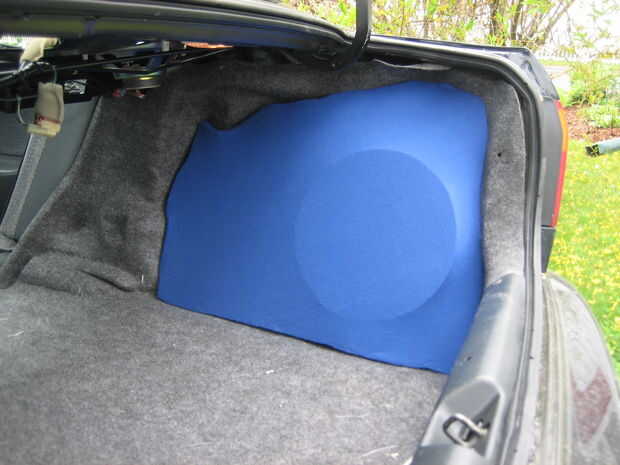 De nuevo, utilice pegamento caliente para unir el material de algodón a los bordes exteriores del recinto y recorte el exceso. Ahora es un buen momento para probar el ajuste de la caja para que tengas una idea de lo que el producto final se verá como. Si no te gusta cómo se ve entonces cortar el algodón, vuelva a colocar el anillo de altavoz y vuelva a intentarlo.