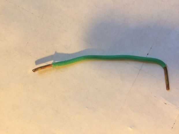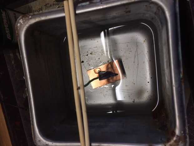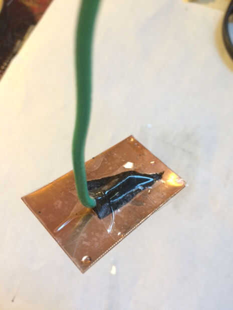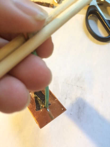 Luego tome un pedazo de alambre revestido de cobre y cinta adhesiva en la parte posterior de la pieza de cobre diseñada y colocarlo donde flota sobre el agua sal - yo uso palillos y sandwich el alambre entre los palillos para sostenerlo para arriba.