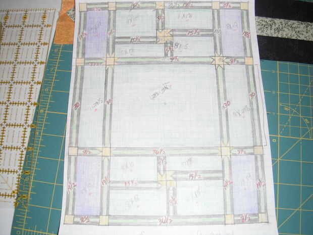 Aquí es uno de mis proyectos que se hace de que tenían que tener material sólo porque no puede tomar sus ojos fuera de él. He incluido mi dibujo para darte una idea de lo fácil que es hacer su propio diseño de encargo del edredón. Usted también notará que fue creado en secciones para facilitar el montaje. Solía estrellas y enrejado de llamar a las líneas de división. Me encanta edredones que son simétricas y tienen repetición impar. También guardo cosas en mente en cuanto a la colocación de los parches donde se fijan las almohadas y donde será el borde de la cama por lo que la frontera colgará la plaza con la cama. Se trata de trabajo realmente personalizado para mi casa. Se puede también lograr con simples parches, una cinta métrica y un poco de planificación.