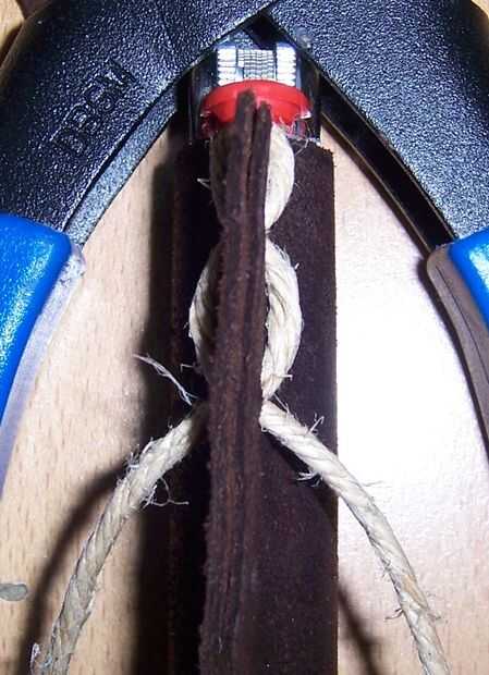 Tomar el cable por la mitad y correr a través de los agujeros de ambos lados y realiza un squareknot el último agujero.