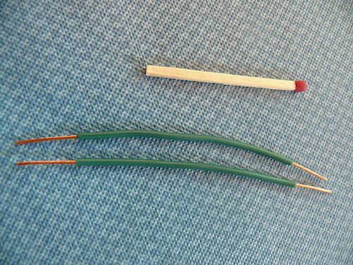 En primer lugar, cortar dos 3" pedazos de cable para el encendedor. Tira de 1/2" de cada extremo. Línea de los cables en ambos lados de un partido, con uno de los extremos de los cables pelados con la cabeza de fósforo. Enrolle cinta aislante alrededor de los cables y el partido para mantener en su lugar. Asegúrese de que ha hospedado en lados opuestos del partido después de pegarlas a él. Ver la segunda imagen de abajo para la colocación de estos cables.