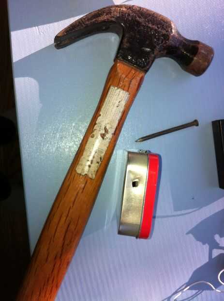 Inicio tomando su lata altoids y meter dos agujeros con el clavo y el martillo. Asegúrese de que esto es en el frente o lado desea que la conduce a venir fuera (lado que desee para poder encender desde)