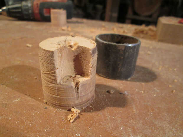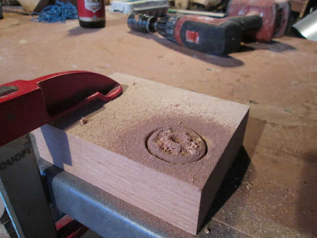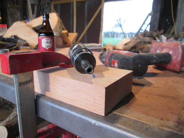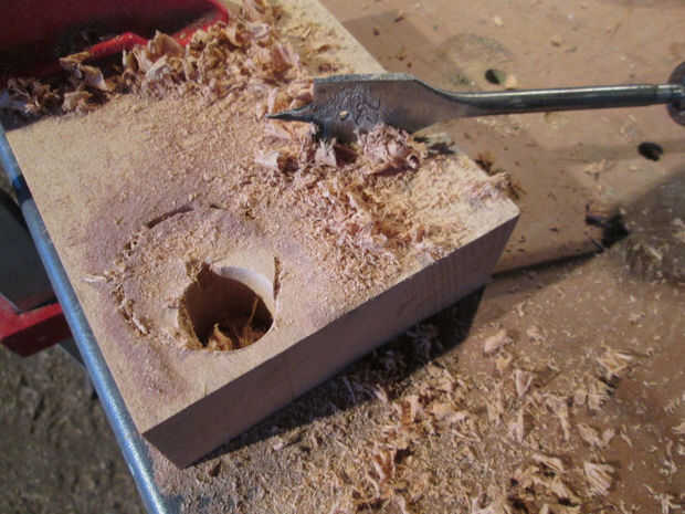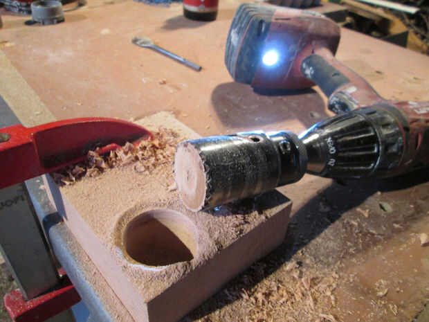 Haz un taladro reloj y perfore hasta la mitad en un trozo grueso de madera.