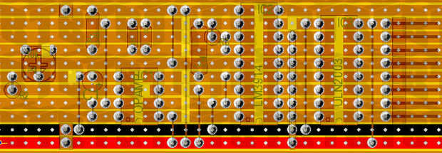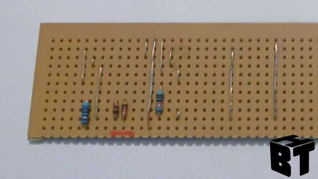 Utilizando el esquema Inicio agregar componentes a la placa de circuito. Empezar con las partes más bajas del perfil primero como enlaces de cable y diodos Zener. Observe que los diodos Zener son polarizado (necesidad de ir en una dirección específica). Cuando inserte las piezas voltee la placa y soldarlos en el lugar. Si pones todas las partes de una vez algunos caerán cuando dan la vuelta así construir el circuito de.