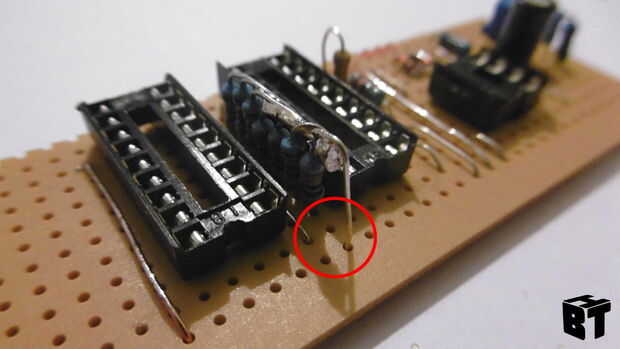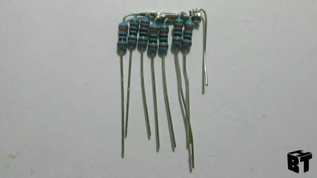 El otro método es hacer la matriz. Tomar uno de tus 10 resistores de k y doblar una pierna a 90 grados. Recoger 6 otro y hacer lo mismo por lo que se unen las patas dobladas. Todas estas patas juntos dejando el último tramo de resistencias separado del resto ya que este debe conectarse a la soldadura el + ve tira. Inserte la matriz en la placa del circuito haciendo que la pierna común va a la fuente correcta.