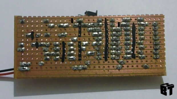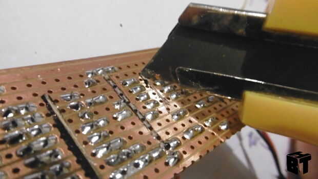 Antes de completar el circuito que necesitamos hacer cortes en las pistas ya que no queremos todas las pistas llevando a cabo. Usando el diagrama marca el tablero con un lápiz y luego cortar las pistas con un cuchillo afilado.