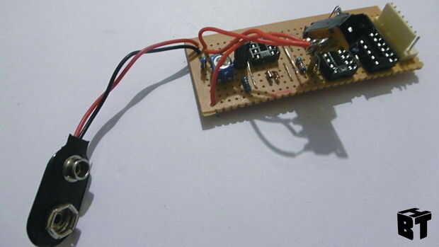 El circuito es alimentado por una batería de 9V, el cable rojo va a la franja superior basada en el diagrama, el cable negro va directamente a continuación.