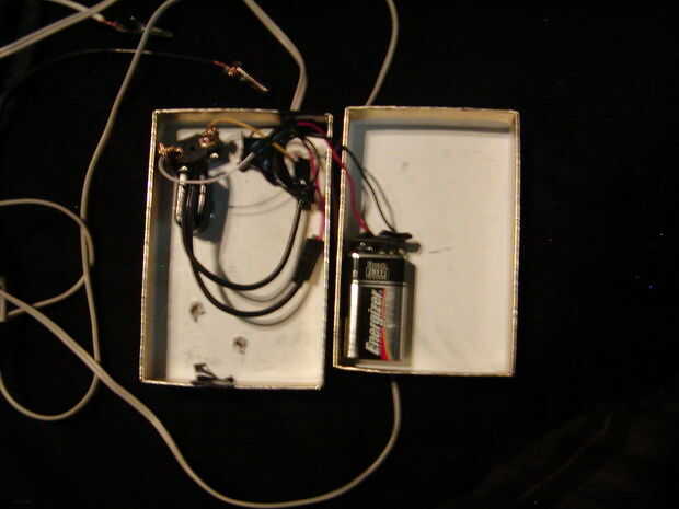 Conecte las cosas dentro. Conecte uno de los cables de la batería de 9v para el interruptor y el otro cable del interruptor a cable del interruptor de un empuje y el empuje de otro cable a uno de los cables en el pequeño auricular jack lo (femenino) y otro para auriculares jack cable al otro cable de batería de 9v. Utilice cinta aislante y cinta adhesiva todas las conexiones. el viejo cable tuve que tuvo algo de enchufe macho salida en ambos lados, así que corte uno, los cables pelados y poner cocodrilo cips en el extremo.