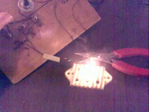 No ir usando un condensador o algo, para obtener como 350 voltios, aunque. Necesita estar en más de la fracción de una segunda descarga de condensador para calentar el alambre.