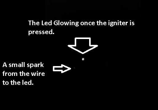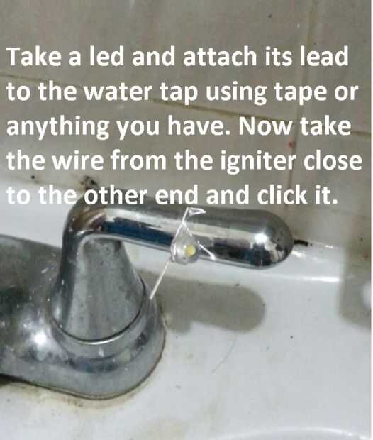 Para ello necesitamos un buen terreno. Cuando digo tierra no me refiero a suelo, osea un lugar para la electricidad ir a. Tus grifos son muy buenos para esto. Ir a un grifo de agua y una de las patas de un L.E.D a éste. Llevar el encendedor cerca de la otra pierna y haga clic! No hacer contacto de la ignición con led mientras hace clic. Mantenga a una distancia y ver chispas en primer lugar salto de alambre para el diodo emisor de luz y luego ves el resplandor L.E.D para un flash de luz tenue. Aunque LED quemado a 10 voltios o más, aquí la tensión se fija para un tiempo tan pequeño y la corriente es tan baja que no quemará el L.E.D.