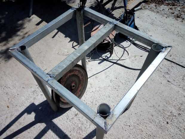 la parte superior es cuadrada 1 caja y media pulgadas cuadradas, es de tamaño 20" x 24" y las piernas se sueldan con autógena en el interior las esquinas.