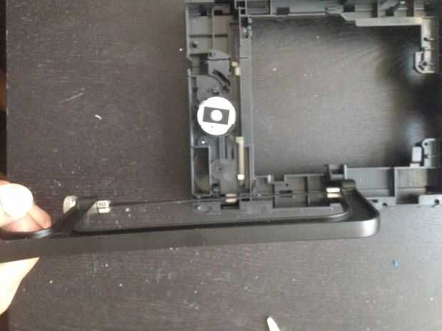 Ahora con una sierra, cortar el plástico justo por encima de la puerta del CD bloqueo de mecanismo y la articulación en el lado como se muestra en la foto de arriba.