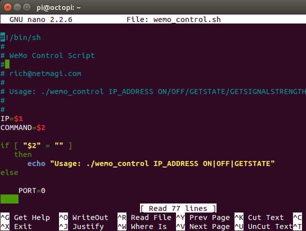 Copiar el script de Wemo Control de http://wemo.forumatic.com/viewtopic.php?t=5&p=5 y pegar en nano.