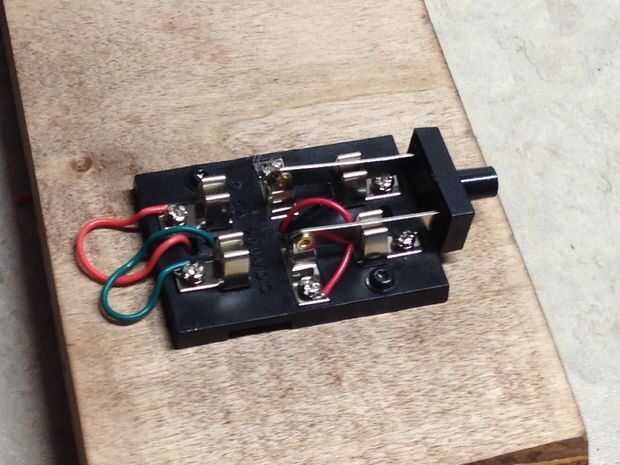 Hay una foto con un primer plano del interruptor de cuchillo después de ser conectado a la base. Los cables en el medio son los cables del portapilas (perforé un orificio separado para ellos en el interruptor) y los cables en el extremo de las luces.