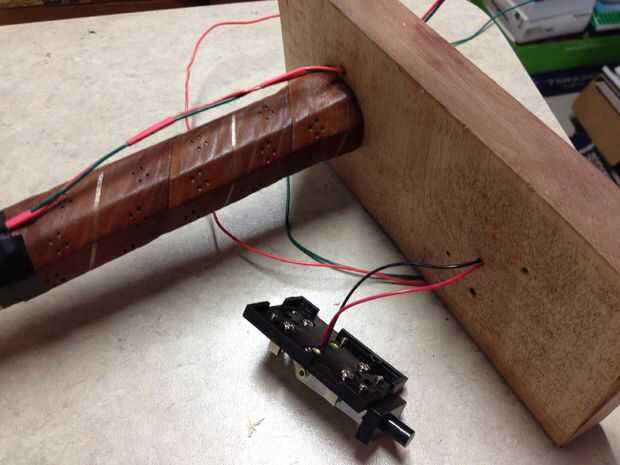 En una sola imagen, se puede ver el cable que viene por la parte trasera de la empuñadura y en la base, y la contracción de la tubería une los cables. También puede ver los cables del portapilas conectados al interruptor. Los cables de las luces no colocados el interruptor aún.