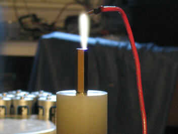 Los arcos se vuelven mucho más calientes cuando una mayor tensión de alimentación se usa junto con una mayor frecuencia del controlador. Los cuadros siguientes muestran funcionamiento con tensiones de alimentación de mayor potencia. Observe que el arco es ahora un caliente y amarillo.