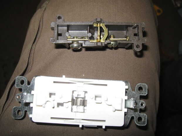 Dentro del cuerpo del interruptor son 3 partes. Hay dos secciones fijas y una tercera sección movible. Tome nota de cómo las piezas de trabajo y desmontar.