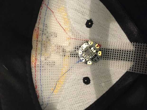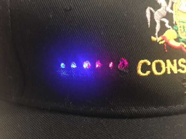 Los LEDs se veían detrás del material del sombrero pero apenas. Usé el soldador quemar agujeros en la superficie del sombrero cerca de los LEDs. Ahora los saltos luz derecha hacia fuera como debería.
