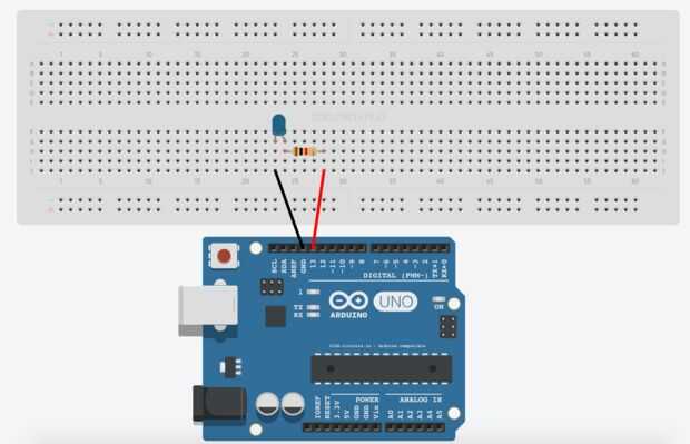 Si usted sabe su manera alrededor de un protoboard, una resistencia y un LED, puede hacer una conexión en serie entre el led y el resistor. La entrada es desde "Pin13" en el Arduino y el suelo va a "GND" en el Arduino.