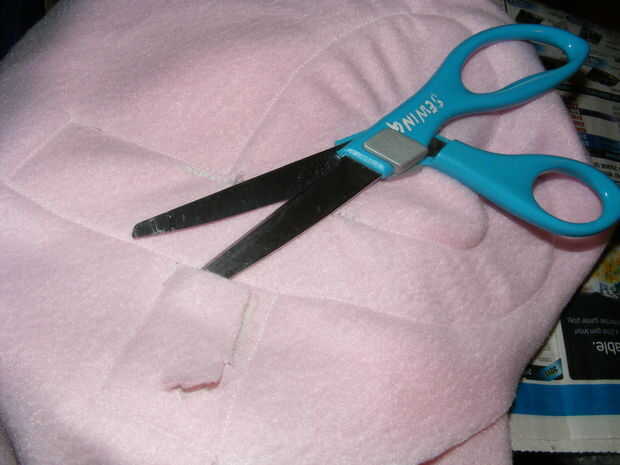 En la parte delantera, corte la tela el diseño del logo de la cinta. Puede que necesite a pinzar a la tela y cortar una raja para la tijera obtener cortar. Corte cerca de la costura.