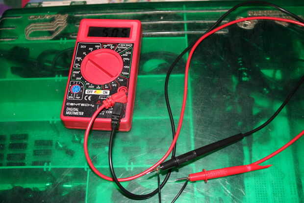 Nunca doy por sentado que la etiqueta de una fuente de alimentación es correcta, por lo que siempre reviso el voltaje con un medidor eléctrico. Esto suponía 5 voltios de salida. Estaba muy cerca en 5.05. Hacer una nota de cual cable es negativa por lo que conectar el led correctamente.