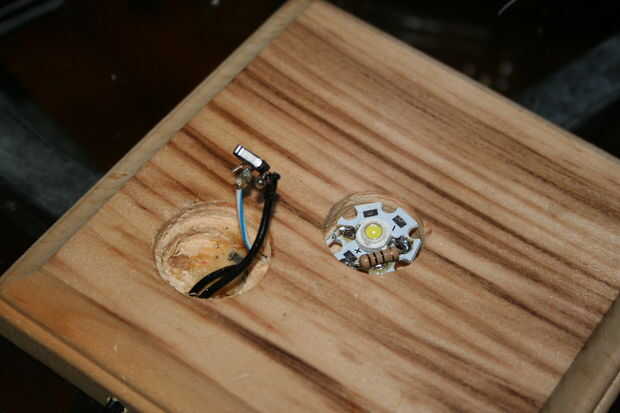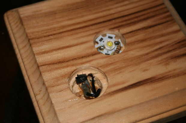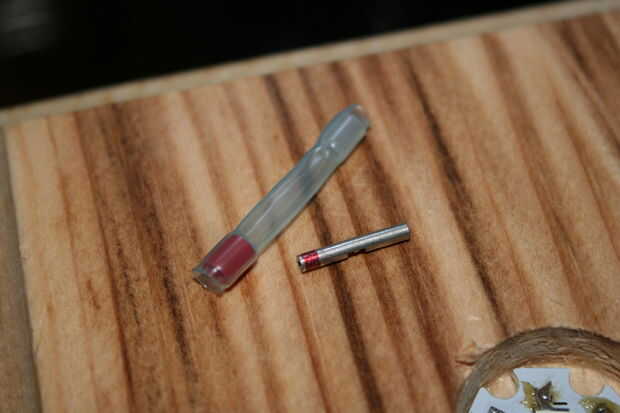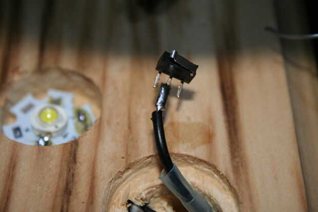 Una vez había llegado a este punto, me di cuenta de que debo haber soldado los cables del interruptor primero. El cable era tan corto que tenía no hay espacio para trabajar. Decidí improvisar. Tenía un empalme de tope pequeño que corté por la mitad. Usé cada mitad en los cables y las conexiones del conmutador con unos alicates para prensarlos. Luego, calentar con el soldador y llenó de soldadura para hacer las conexiones sólidas. Tiempo para conectarlo. ¡ Funcionó! Trabajé el interruptor en la parte inferior del agujero y viró hacia abajo con una gota de pegamento del gorila. También había cubierto todas las conexiones eléctricas con la capa conformal.