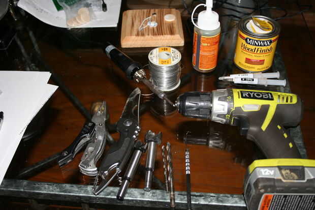 Este proyecto no requiere muchas herramientas. Usé un taladro y varios pedacitos de taladro de tamaño, alicates, cuchillo, soldador y soldadura, térmica epoxy, pegamento del gorila y sellador de madera. Ahora viene la diversión parte, permite hacer algo!