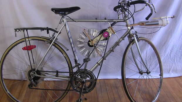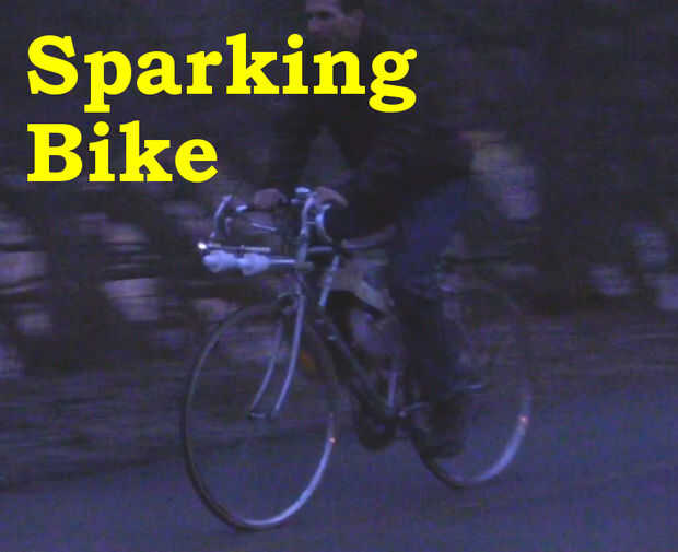 Una forma que he encontrado es añadir en una máquina de Wimshurst, una máquina electrostática que produce chispas. Lo cool es que la máquina de Wimshurst funciona girando dos discos, normalmente utilizando una mano manivela... pero conectar hasta los pedales de la bicicleta y ahora gira los discos como se pedalea! Para que sea más fresco, esta uno incluso utiliza un piñón impreso 3D!
