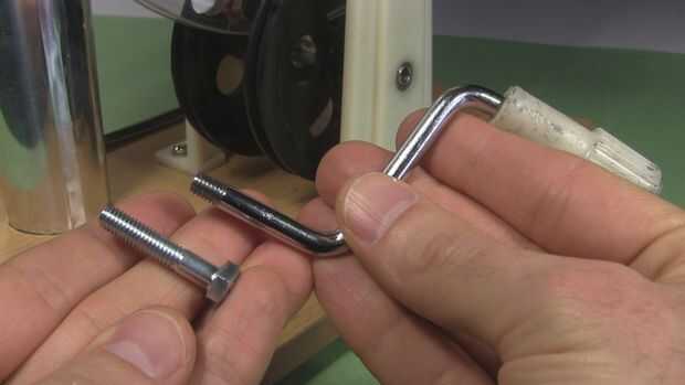 Mi manivela girará los discos en una dirección y girar en la otra dirección desenrosca la manivela del conjunto del disco. Como se puede ver en la foto, la manivela tiene la rosca. Llevar a una ferretería y encontrar un tornillo con rosca a juego. En Home Depot encontré un perno con roscas (métricas) M6 emparejados. La longitud del perno, no incluyendo la cabeza es 1 3/16 pulgadas / 3cm.
