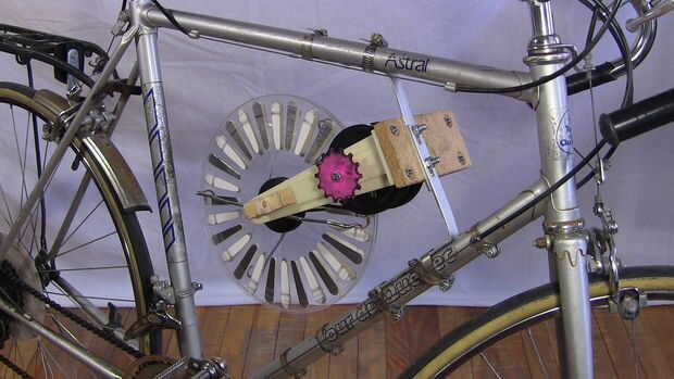 Encontré que el conjunto de disco encajan muy bien el área abierta debajo de mí en la moto como se muestra en las fotos. Nota que tengo un moto touring/del camino en bicicleta y hay un montón de espacio allí. Aunque usted no quiere el espacio para ser tan pequeña que las piezas de la máquina de Wimshurst tocan el marco de la bici. Asegúrese de que habrá una buena pulgadas / pocos centímetros de distancia.