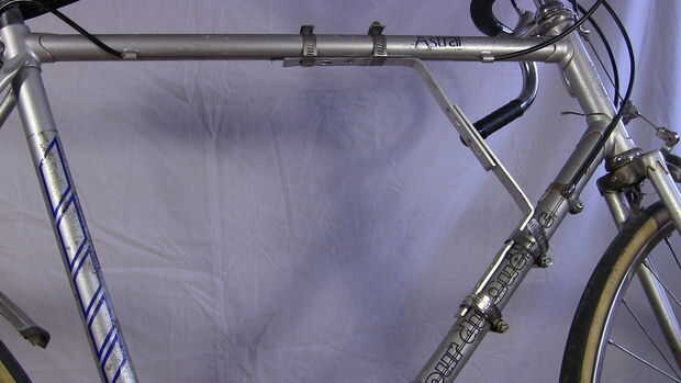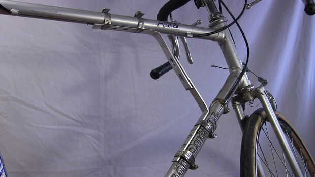 Montar con abrazaderas al armazón de la bicicleta. Desea que los ángulos de la ' V de que las dos patas de ellas forman una cara plana donde puede conectarse el conjunto del disco.