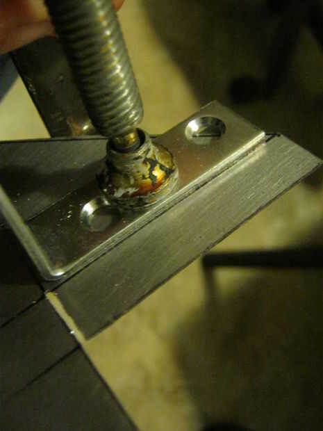 Por último, para doblar el metal sin deformación, la curva se sujeta entre dos piezas de acero más grueso y venció con un bloque de madera hasta que forma un ángulo de 90°.