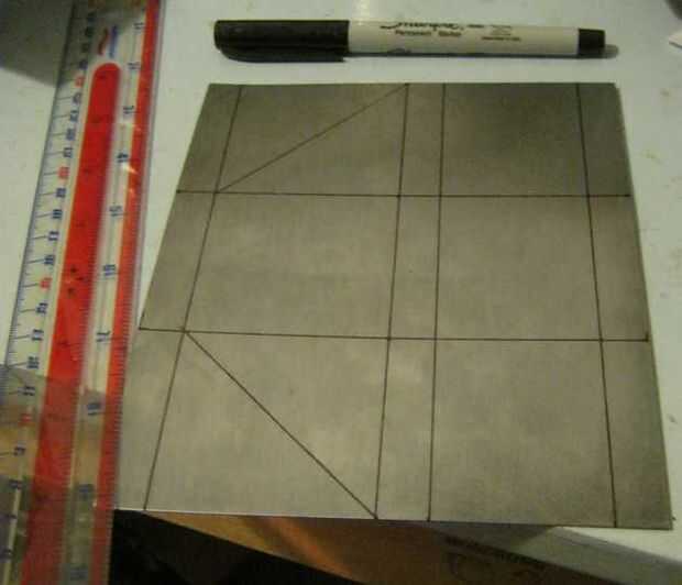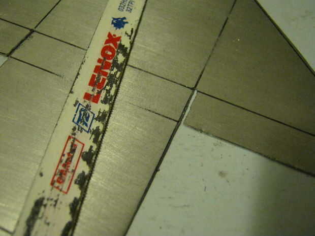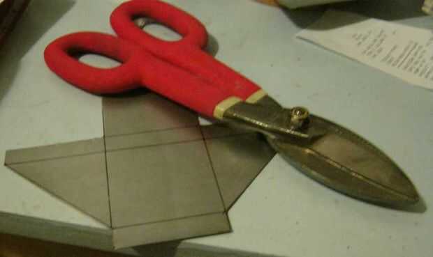 Corte el patrón requiere tijeras de lata. Pequeñas astillas de la hoja se deben cortar para evitar su flexión. Para cortar las aletas flexibles, una sierra de arco se utiliza para cortar muescas sin deformación.