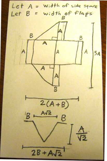 El recipiente de la cera caliente debe permitir que la cadena a la entran y salen de él. La forma más sencilla a que pude llegar era un canal en forma de triángulo. El patrón se muestra encima y debe ampliarse para tamaños más grandes o más pequeñas, dependiendo del tamaño del elemento. Recibí mi elemento de calefacción de una taza de café caliente y fue cuadrado formado así que hice un poco más grande que el elemento de calefacción los lados del canal. Los triángulos en la foto son ángulos de 45°. El material es chapa acero suave piensa.