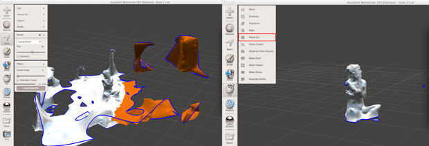Una vez que se realiza la exploración, el siguiente paso es limpiar la exploración - eliminar las geometrías de fondo y otras partes no deseadas. Aquí utilicé MeshMixer, otro software libre por Autodesk. Mediante la función de "corte plano" puede borrar fácilmente las geometrías extras alrededor de su objeto.