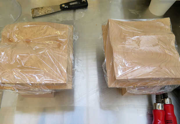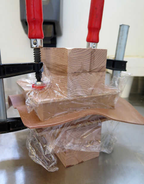 Usé plástico sobre los moldes para asegurarse de que no filtra agua en ellos. Poner un suficientemente grande húmedo pedazo de cuero entre los enchufes machos y hembras, presionan juntos, suavizar las arrugas en los bordes y luego fije con abrazaderas todo bien. La piel mojada puede tomar unos días para secar completamente.