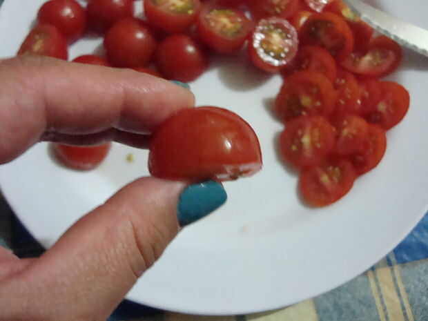 Ingredientes:Huevos durosTomate SaladetMayonesaPasos:1. Corte la parte inferior y la parte superior de los huevos planos para ayudarlos a sentarse recto (vea el vídeo)2. Corte la parte superior de los tomates de Roma como se muestra en el video3. hac