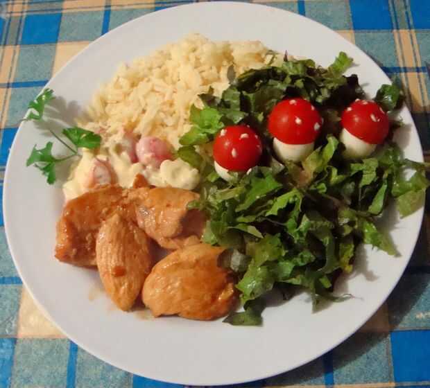 ingredientes:PolloSetaspatatascebollaMayoQueso ralladosal y pimientaLas setas más utilizas la sabrosa se pone!Paso 1: Huevo, pollo, patatas y champiñon preparación: Hervir huevos, patatas y pollo el día antes de que van a hacer una ensalada. Cuando e