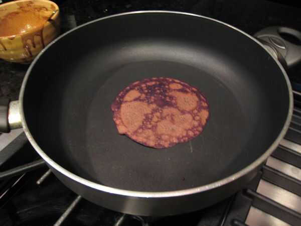 Vierta 1/4 taza de mezcla en el centro e incline la sartén para extender la masa en un círculo.