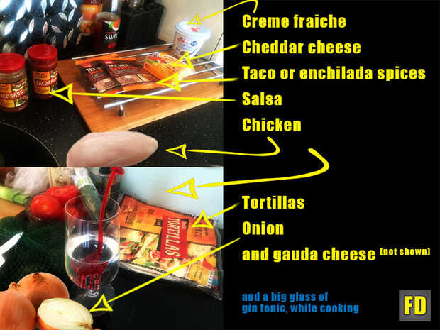 No estoy muy preocupado por cantidades exactas así este instructable es un poco "decidir como vas a". Lo que pongo en estas enchilladas es lo que generalmente disfruto comer, pero creo que su divertido poner en por ejemplo brie en vez de cheddar a veces y usted puede decidir cómo caliente desea que la mezcla de especias. Creo que salsa casera y mezcla de especias casera es mejor, pero esta es mi llegar a casa del trabajo y necesitas escribir algo rápido enchillada. Vea la foto de los ingredientes.